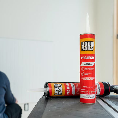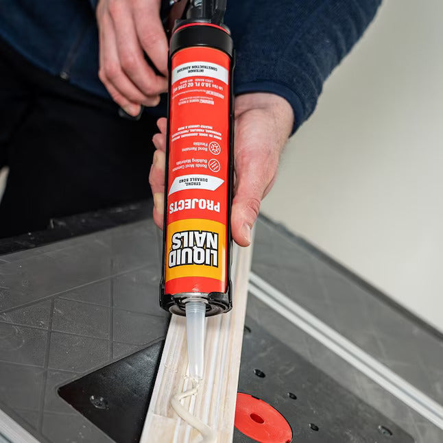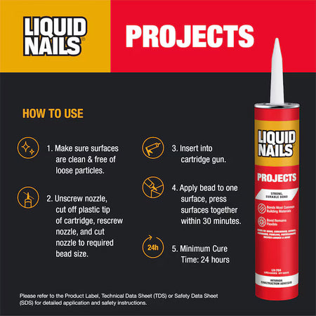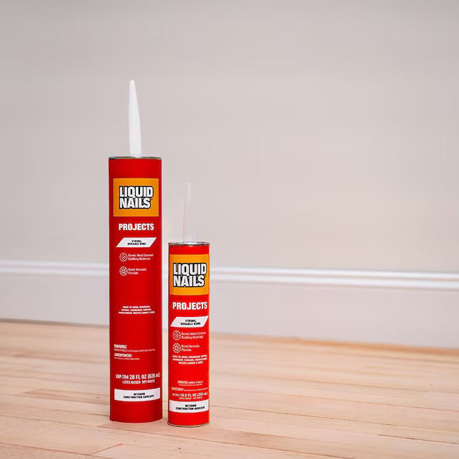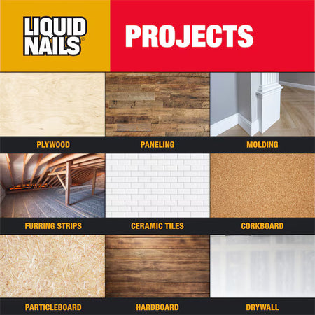 Liquid Nails project, 10 Oz, off white, construction adhesive, interior grade, waterproof, will bond to almost any common building materials including plywood, hardwood, furring strips, paneling, ceramic fixtures, drywall and molding, VOC compliant, rubber based/high solids formula, VOC compliant, replaces TV #284-307 for members in VOC restricted areas.