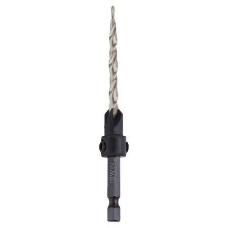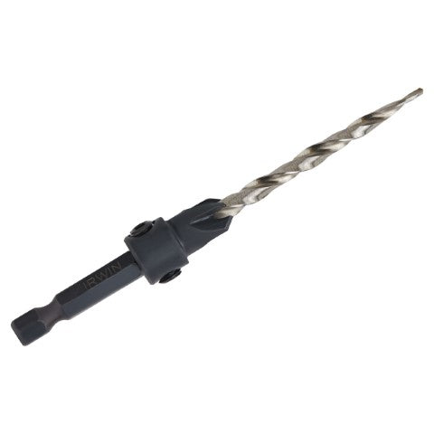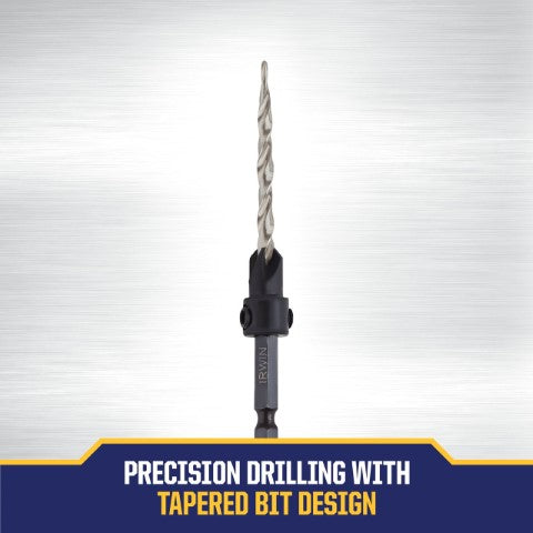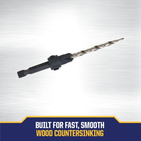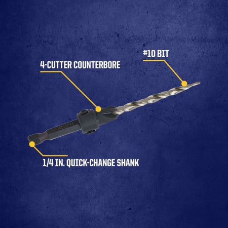 IRWIN Wood Countersinks feature a tapered drill and wide flutes that drill fast, clean pilot holes and ensure a tight fit for screws. They have an adjustable four-cutter counter bore attachment that cuts fast and clears chips quickly for fast, smooth countersinking applications. The counter bore feature attaches flats on shank with two hex screws for a secure fit and can be adjusted for controlled pilot hole depth. IRWIN SPEEDBOR countersink bits fit all standard 1/4" quick-change chucks, including impact drills.